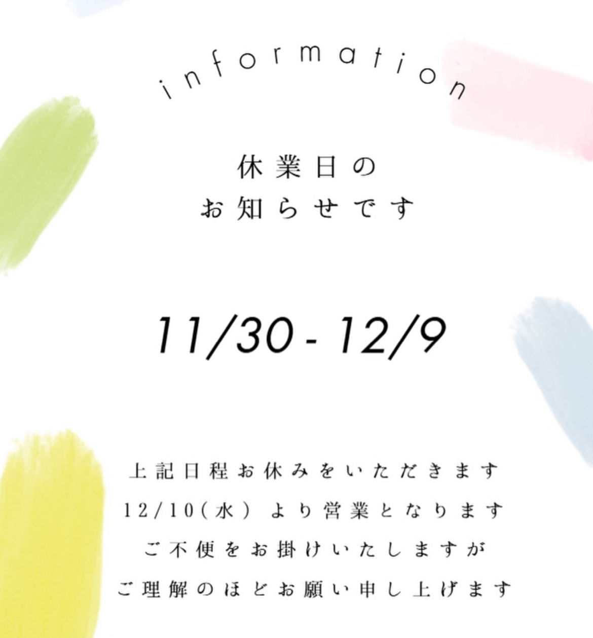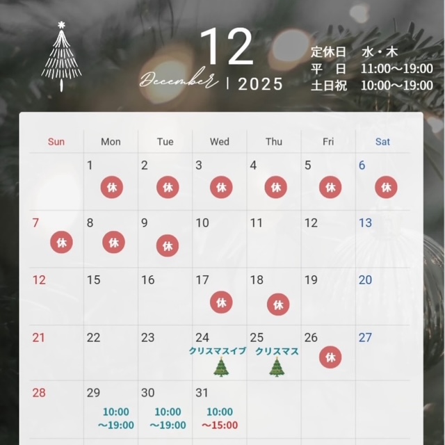 12月の営業日です。 1日~9日は長期研修のため、誠に勝手ながら休業日とさせていただきます。