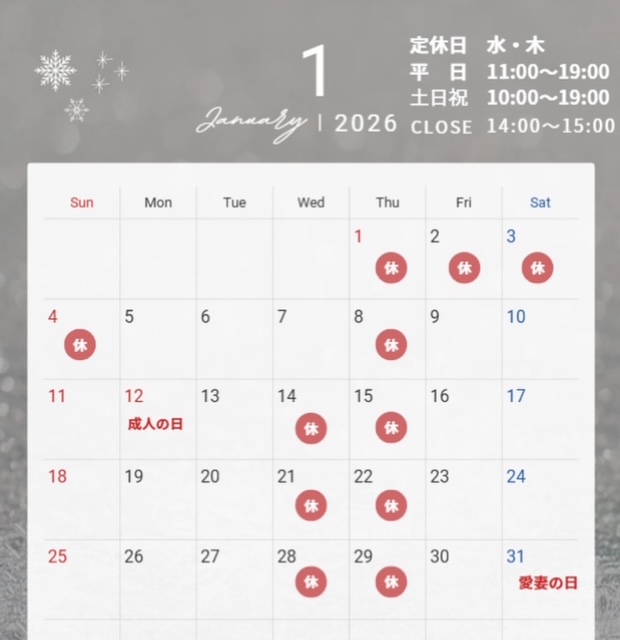 1月の営業日です。新年初売りは1/5(月)(営業時間11:00~19:00)です。